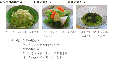 - 1〜数種類の野菜を組み合わせます。50〜100gぐらいがめやすです。好みの大きさに切ります。(例えばきゅうりは2〜3mmの輪切り、だいこんはいちょう切り、きゃべつやはくさいは荒い千切り、青菜は1cm位の小口切りなど)